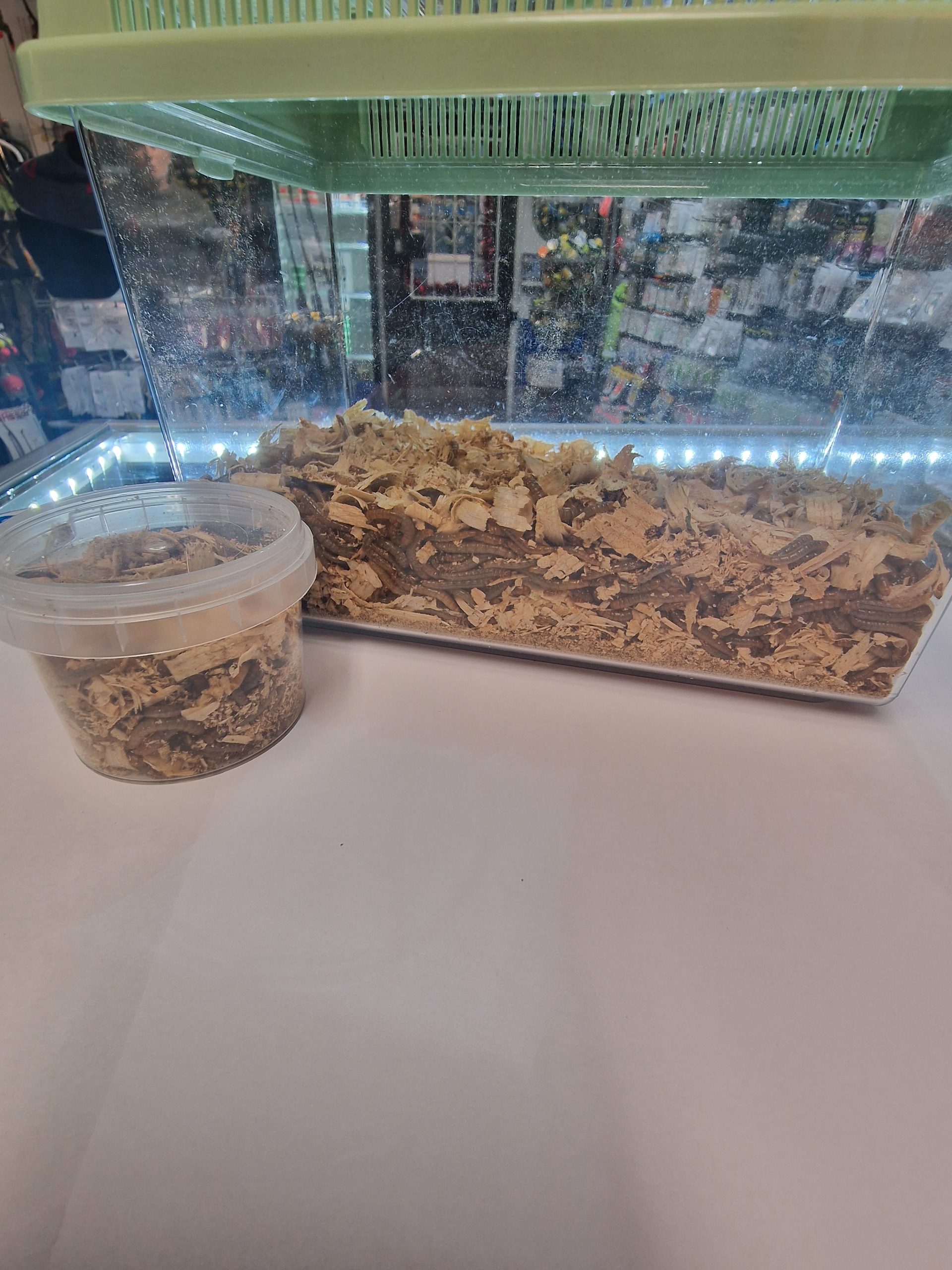 Mjölmask, en burk innehåller c.a 150-200 mjölmaskar.