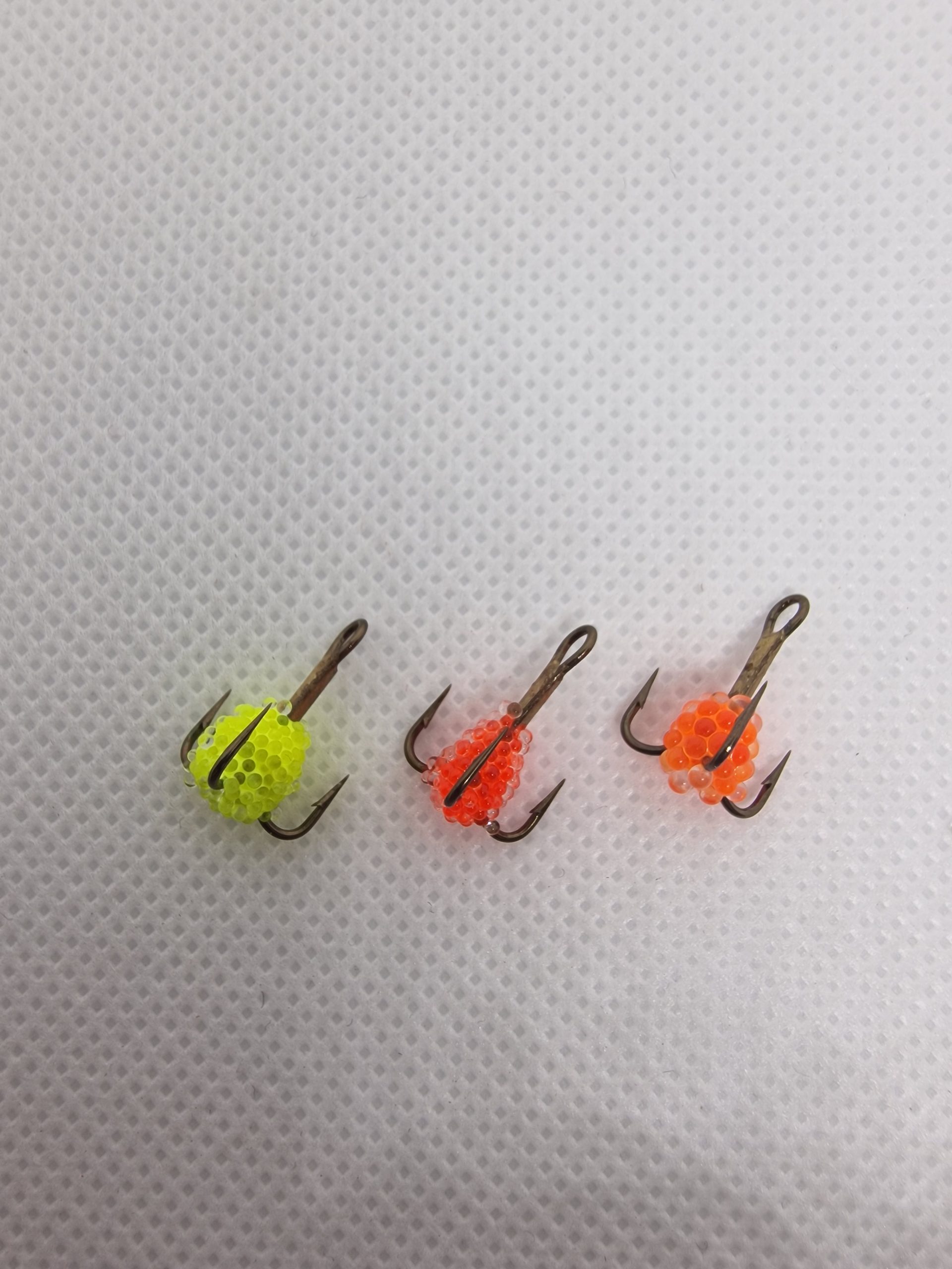 En pimpelkrok med limmade romkorn på i olika färger, perfekt till abborrfiske eller ädelfiske.
